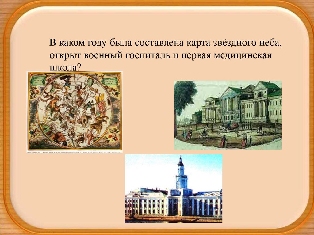 В каком году была составлена карта звёздного неба,открыт военный госпиталь и первая медицинская