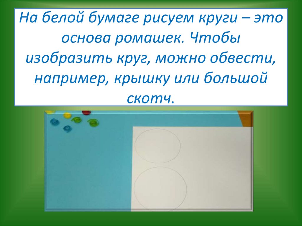 На белой бумаге рисуем круги – этооснова ромашек. Чтобы