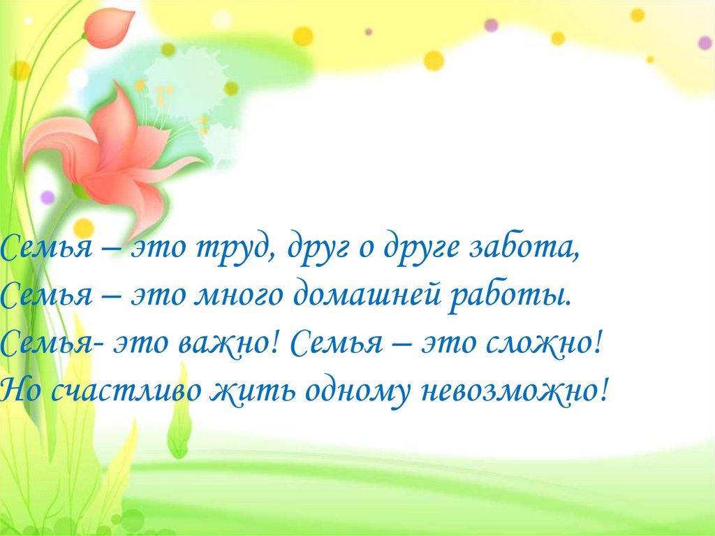 Семья – это труд, друг о друге забота,Семья – это много домашней работы.