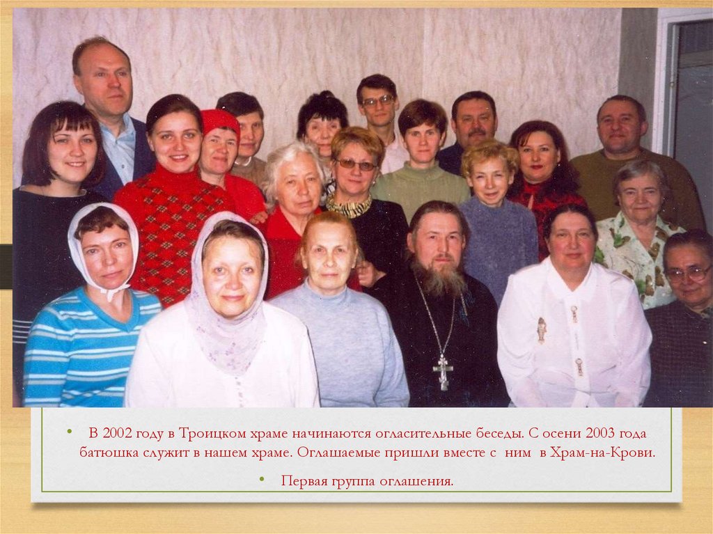 • В 2002 году в Троицком храме начинаются огласительные беседы. С осени 2003 годабатюшка служит в нашем храме. Оглашаемые пришли вместе с ним в Храм-на-Крови.