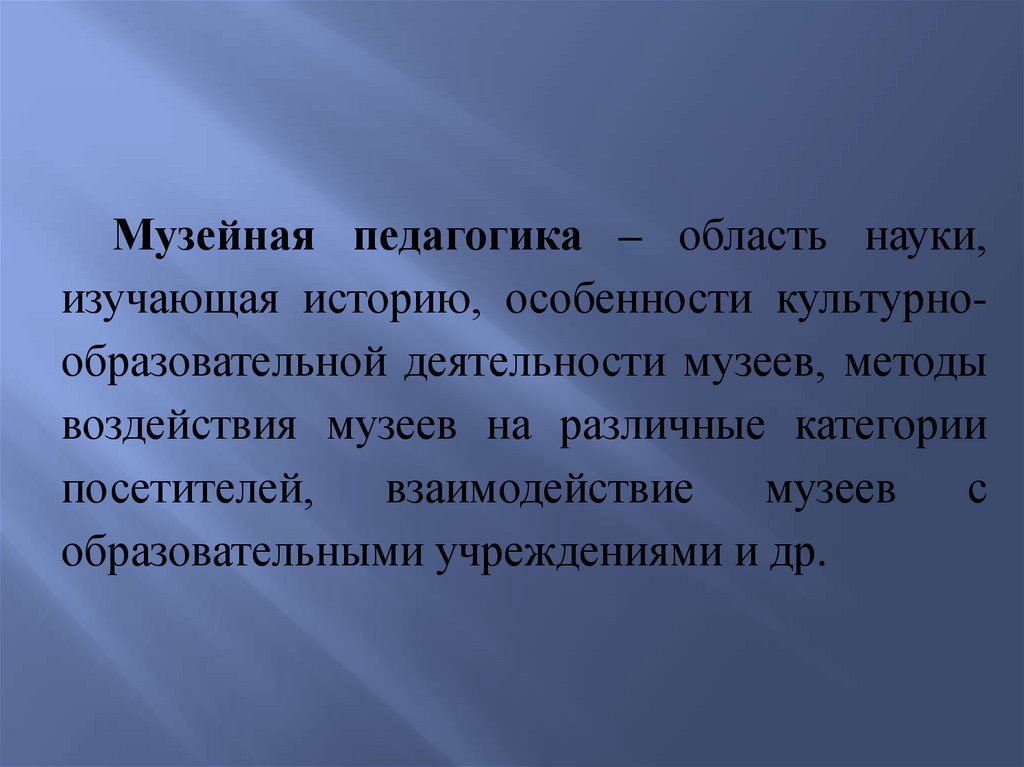 Музейная педагогика – область науки,изучающая историю, особенности культурнообразовательной деятельности музеев, методы
