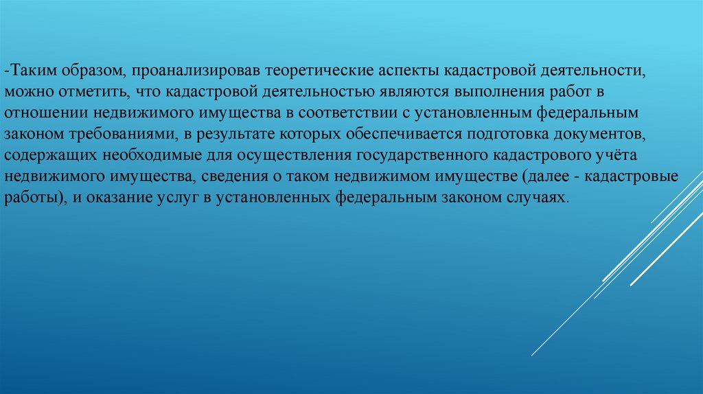 -Таким образом, проанализировав теоретические аспекты кадастровой деятельности,можно отметить, что кадастровой деятельностью являются выполнения работ в