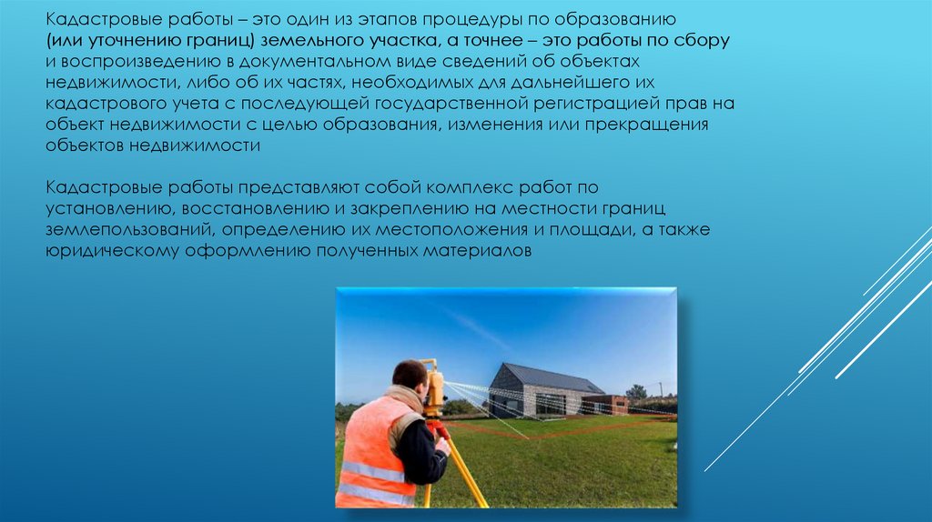 Кадастровые работы – это один из этапов процедуры по образованию(или уточнению границ) земельного участка, а точнее – это работы по сбору