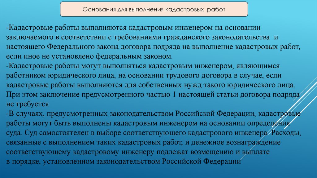 Основания для выполнения кадастровых работ-Кадастровые работы выполняются кадастровым инженером на основании