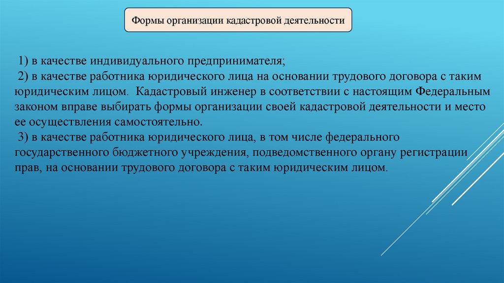 Формы организации кадастровой деятельности1) в качестве индивидуального предпринимателя;