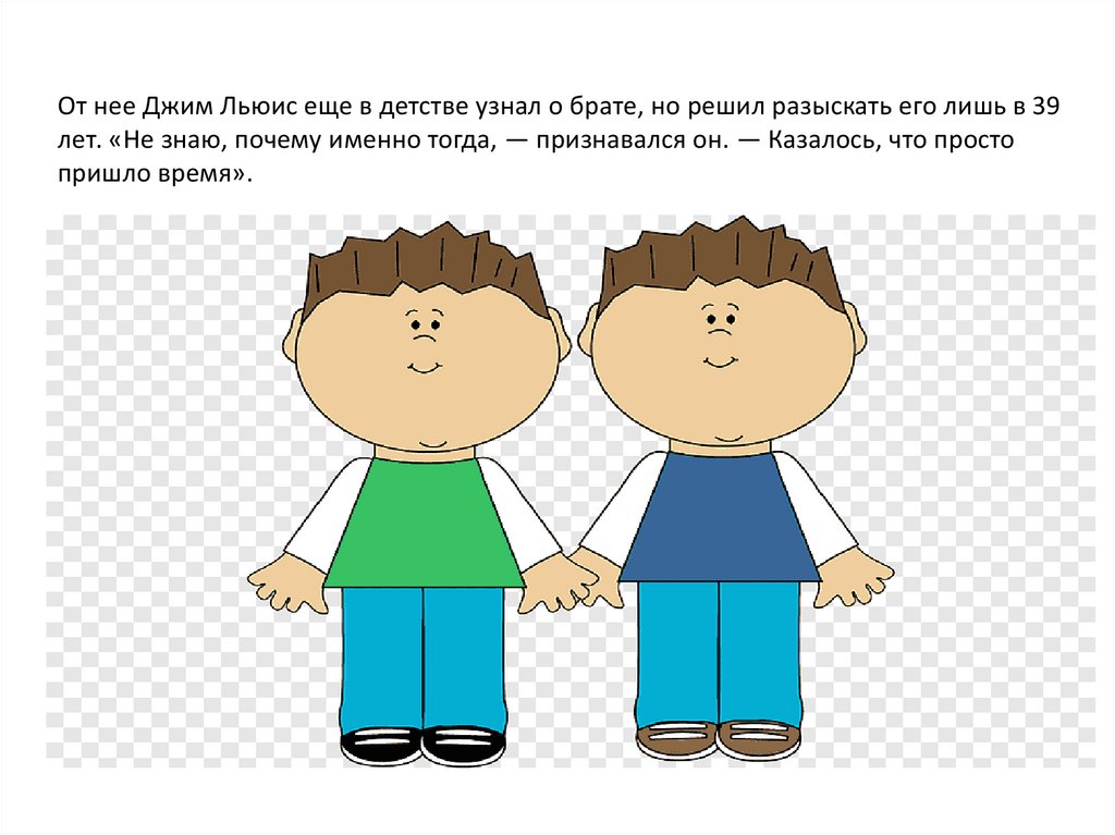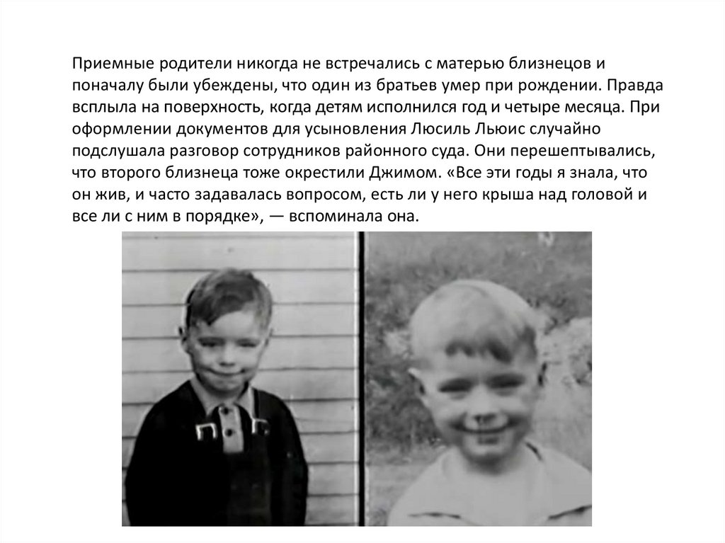 От нее Джим Льюис еще в детстве узнал о брате, но решил разыскать его лишь в 39лет. «Не знаю, почему именно тогда, — признавался он. — Казалось, что просто