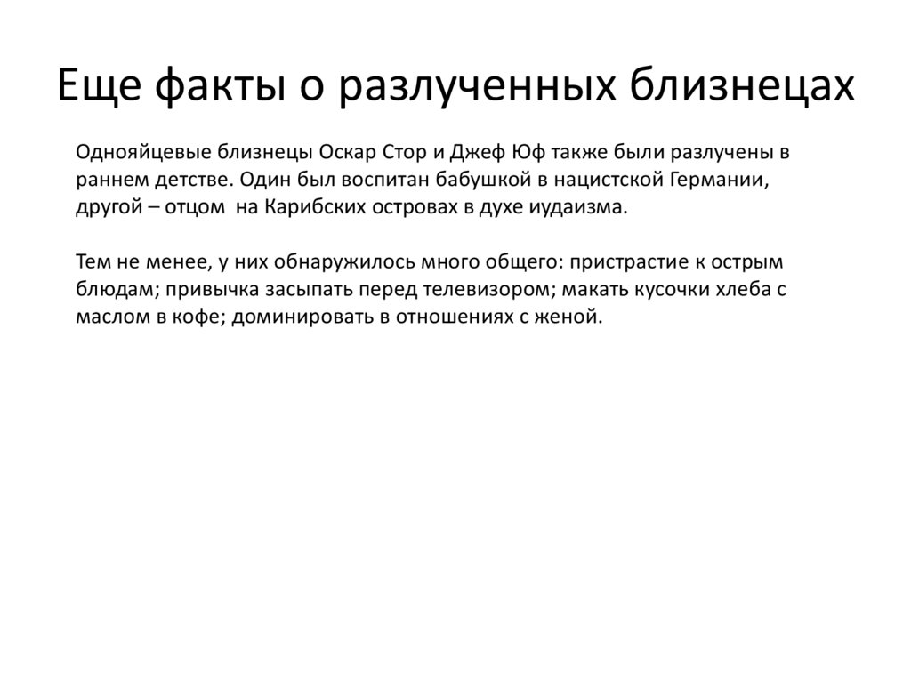 Еще факты о разлученных близнецахОднояйцевые близнецы Оскар Стор и Джеф Юф также были разлучены в
