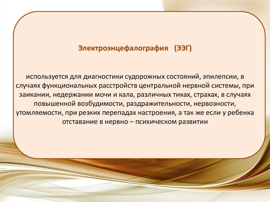 Электроэнцефалография (ЭЭГ)используется для диагностики судорожных состояний, эпилепсии, в