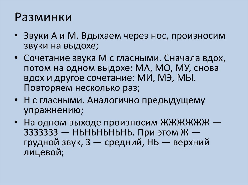 Разминки• Звуки А и М. Вдыхаем через нос, произносим