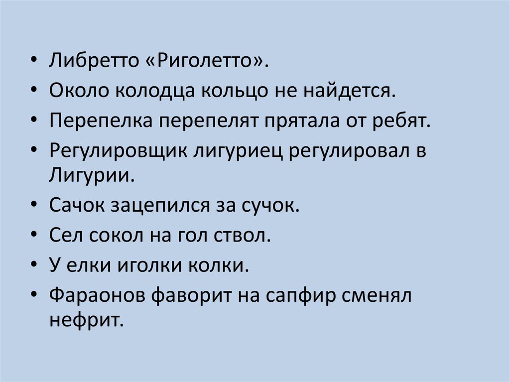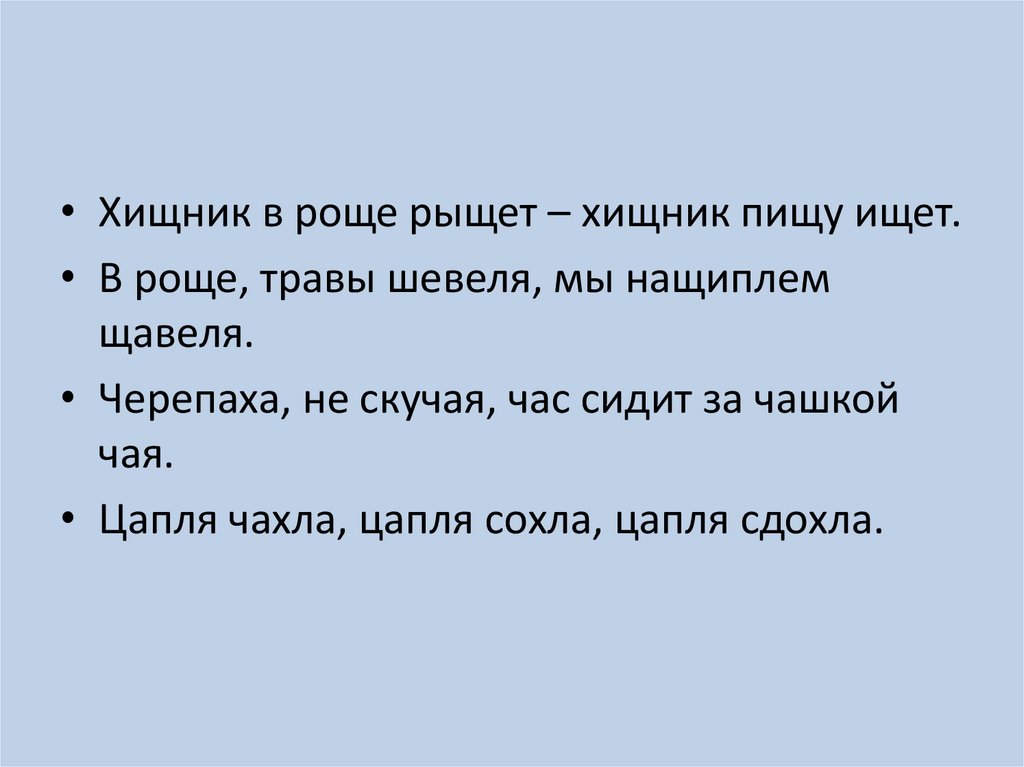 • Хищник в роще рыщет – хищник пищу ищет.• В роще, травы шевеля, мы нащиплем