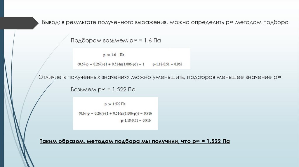 Таким образом, методом подбора мы получили, что р∞ = 1.522 Па