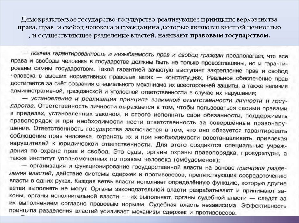 Демократическое государство-государство реализующее принципы верховенстваправа, прав и свобод человека и гражданина ,которые являются высшей ценностью