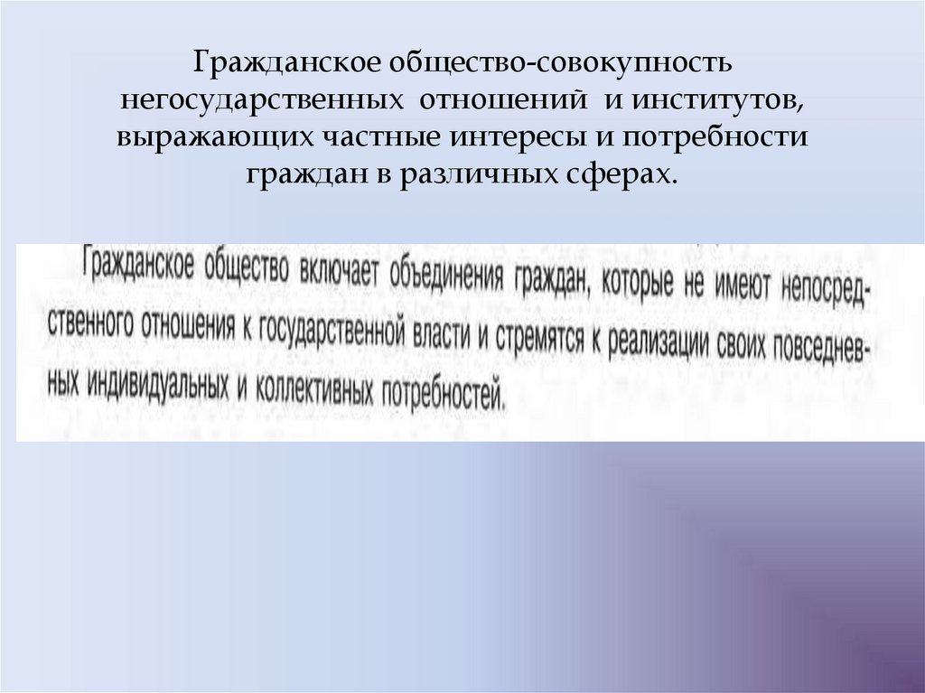 Гражданское общество-совокупностьнегосударственных отношений и институтов,