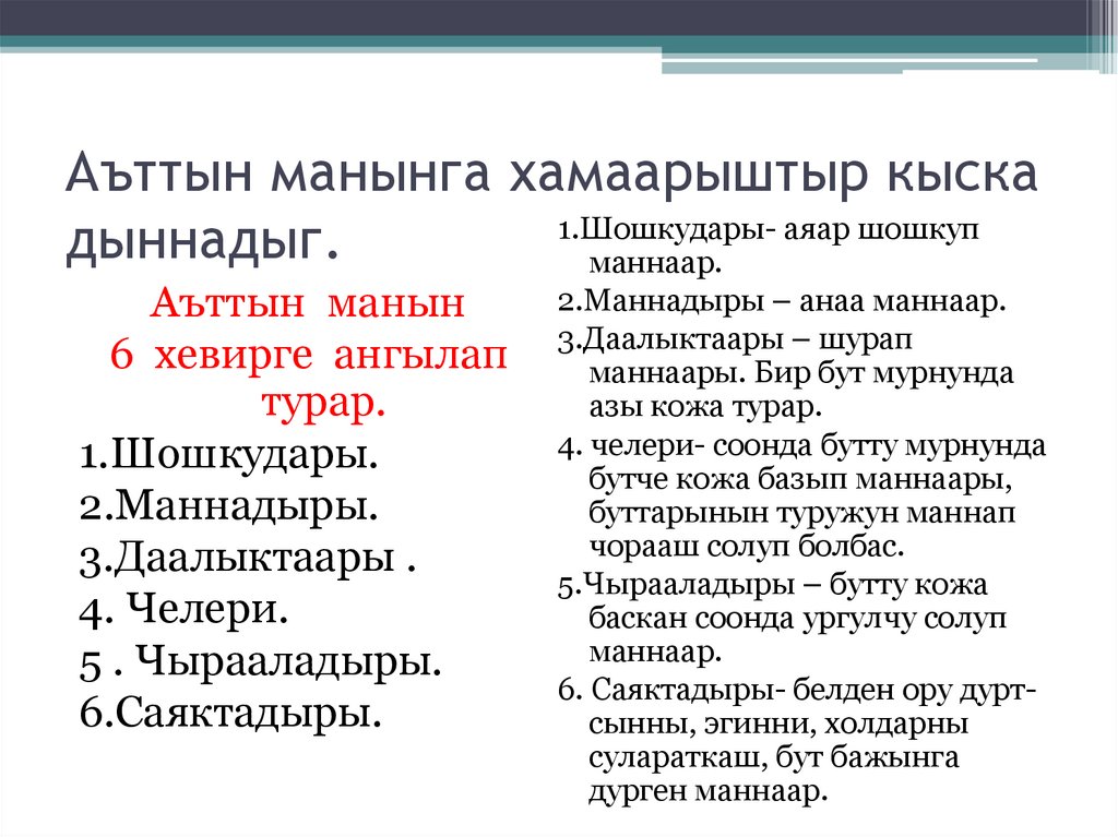Аъттын манынга хамаарыштыр кыска1.Шошкудары- аяар шошкуп