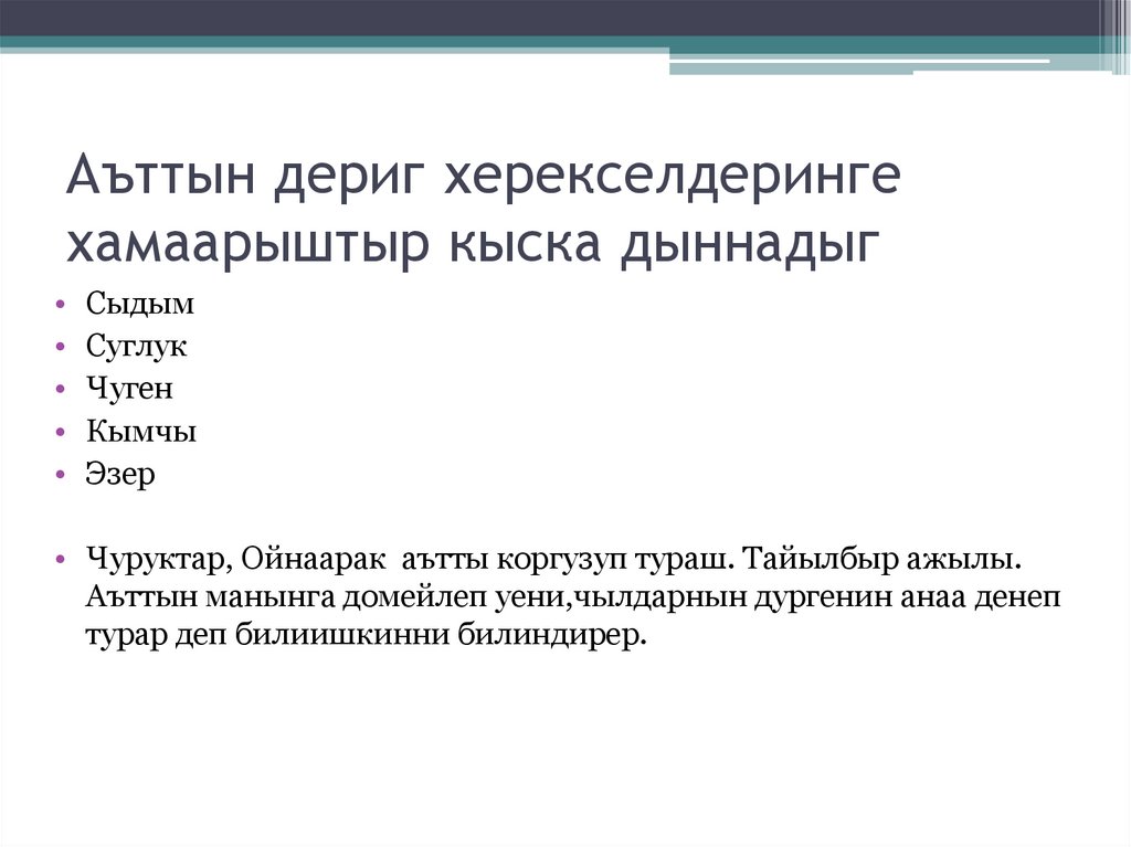 • Чуруктар, Ойнаарак аътты коргузуп тураш. Тайылбыр ажылы.