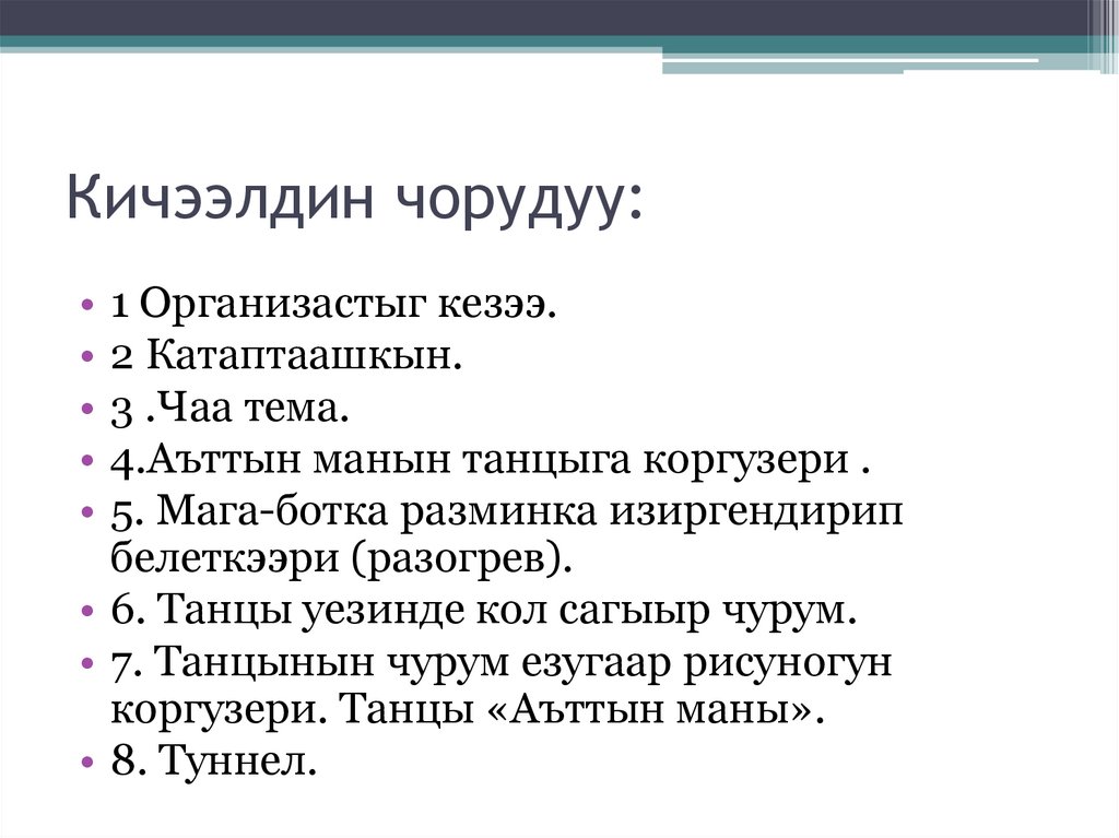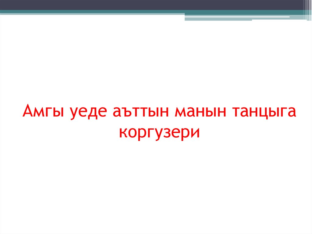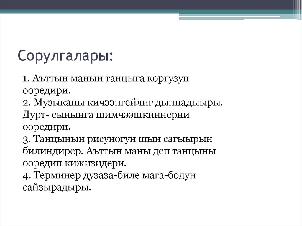 Сорулгалары:1. Аъттын манын танцыга коргузуп