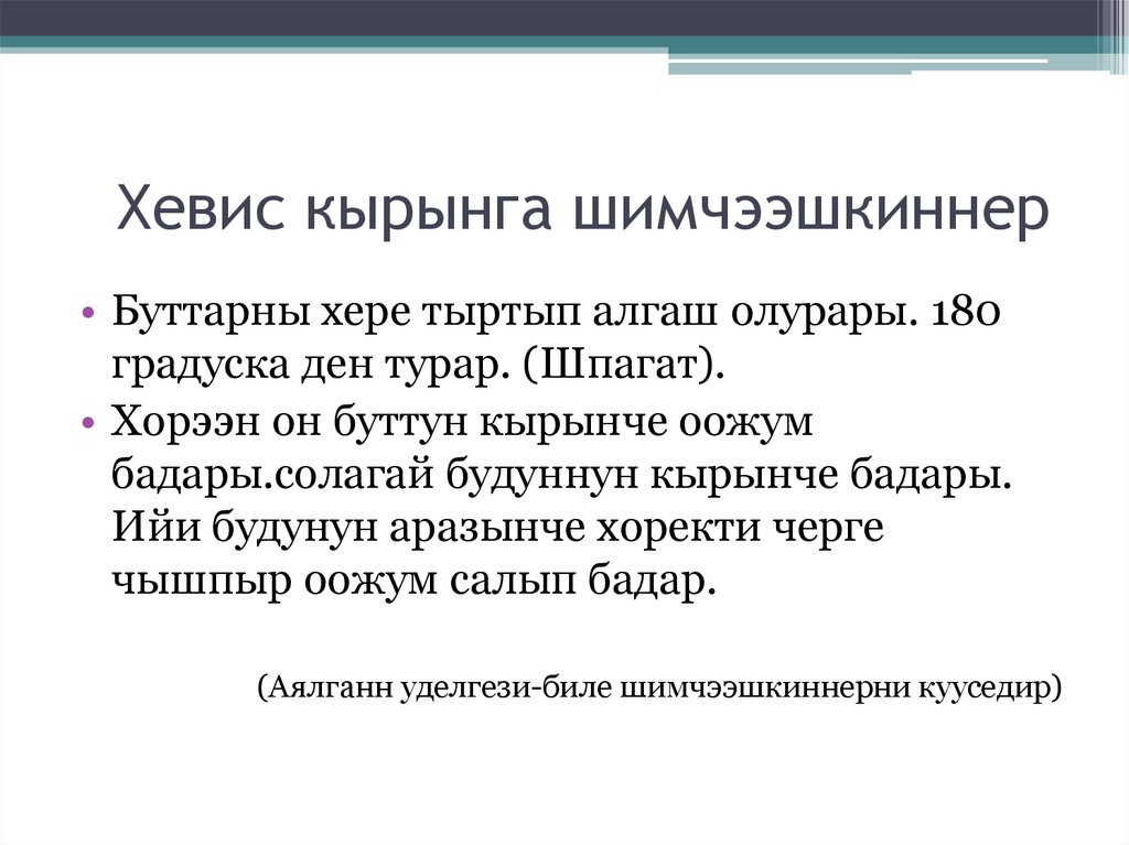 Хевис кырынга шимчээшкиннер• Буттарны хере тыртып алгаш олурары. 180