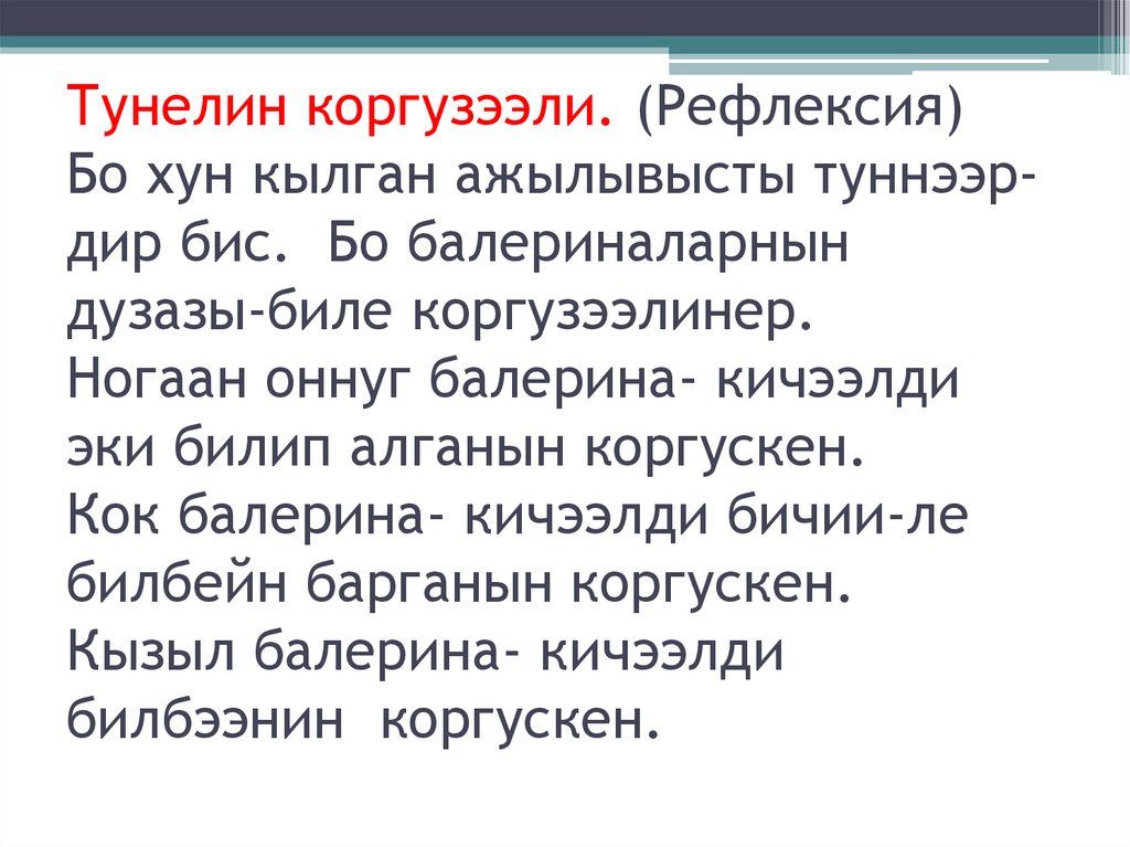 Тунелин коргузээли. (Рефлексия)Бо хун кылган ажылывысты туннээрдир бис. Бо балериналарнын
