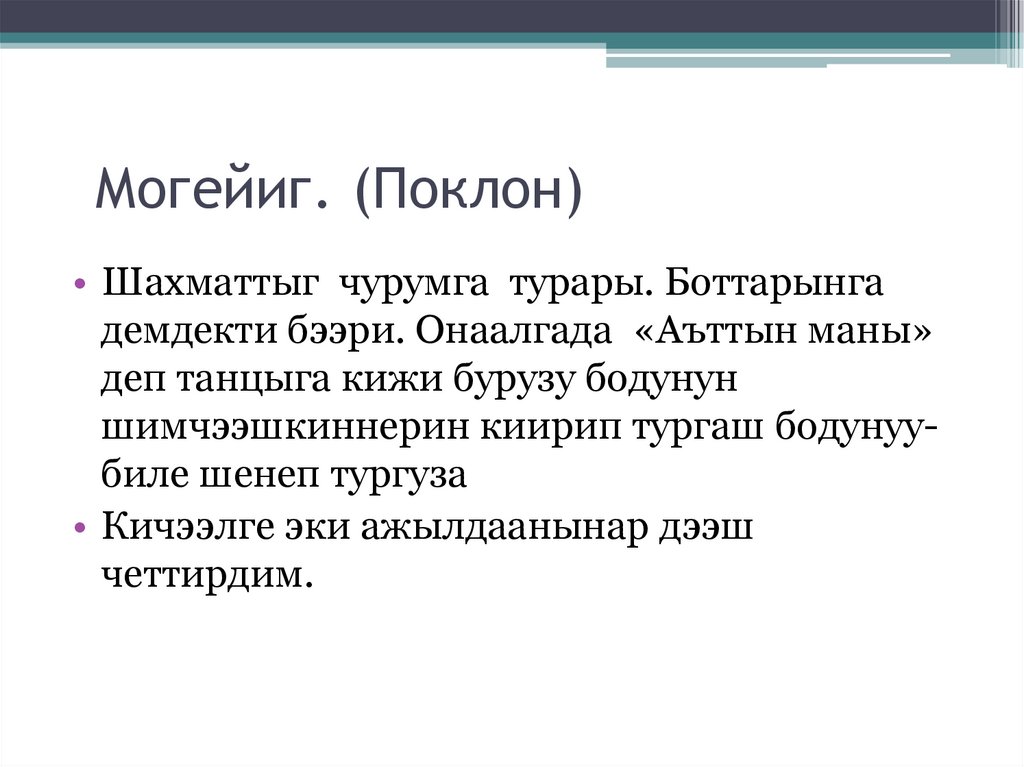 Могейиг. (Поклон)• Шахматтыг чурумга турары. Боттарынга