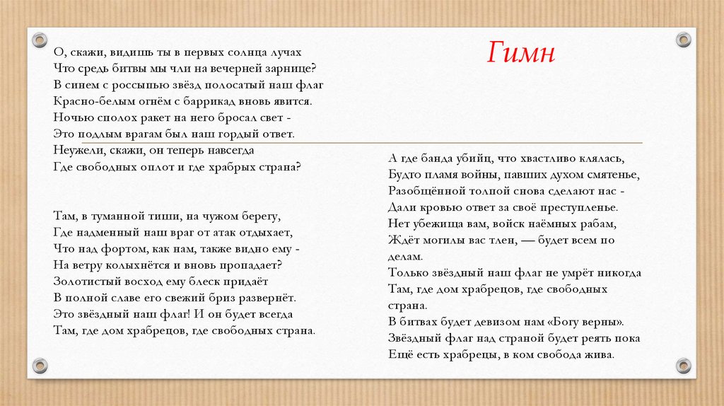О, скажи, видишь ты в первых солнца лучахЧто средь битвы мы чли на вечерней зарнице?