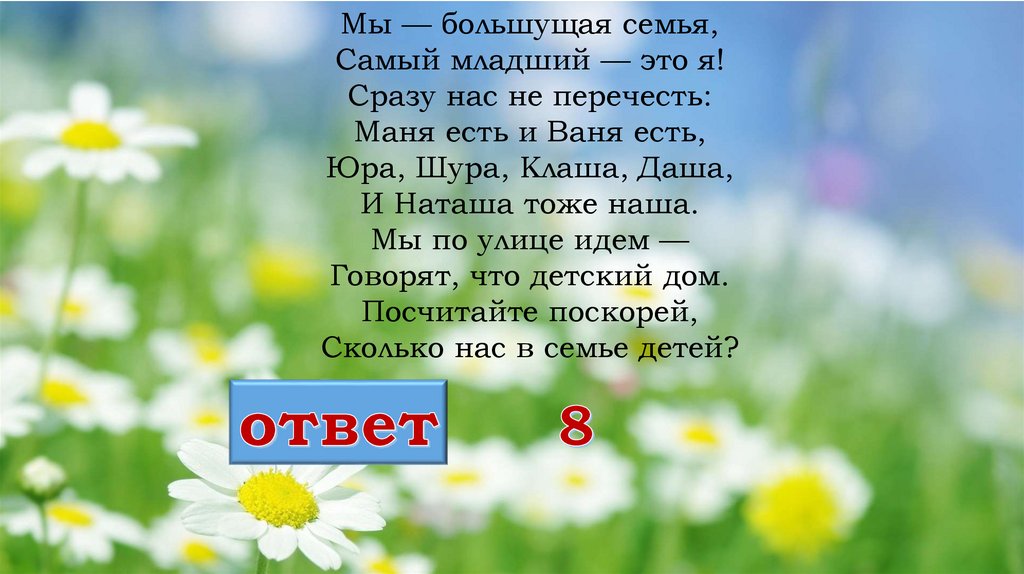 Мы — большущая семья,Самый младший — это я!