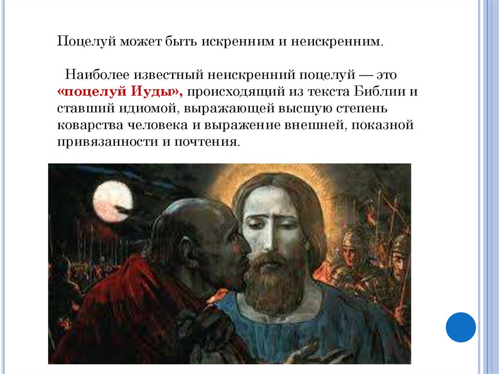 Поцелуй может быть искренним и неискренним.Наиболее известный неискренний поцелуй — это