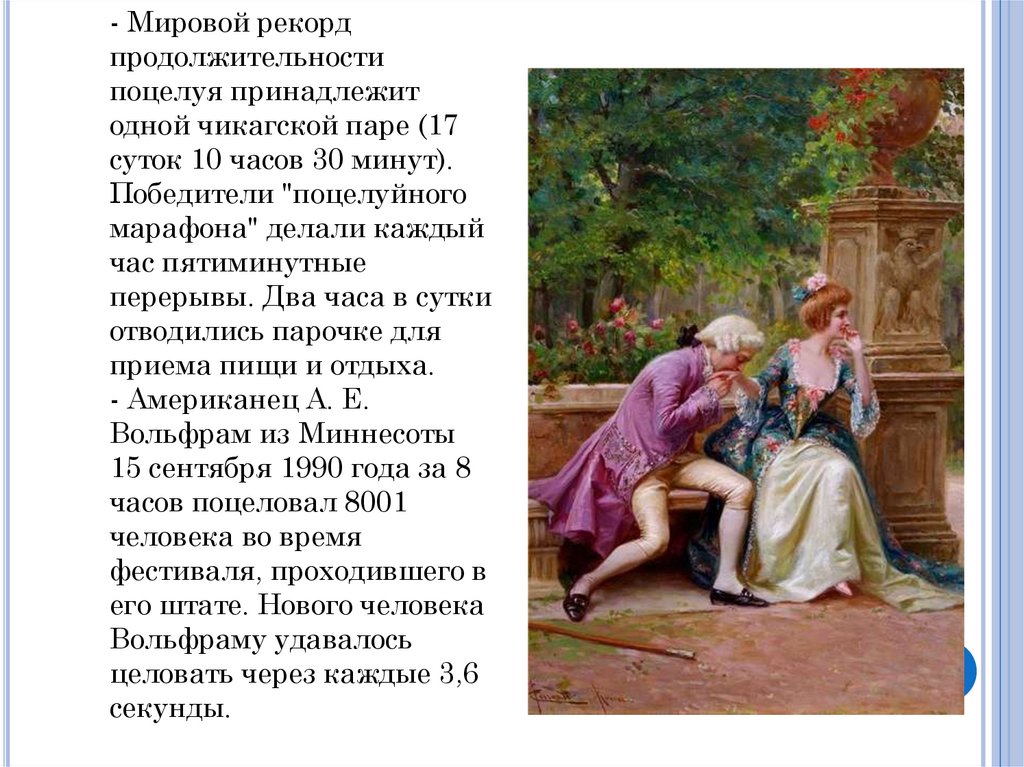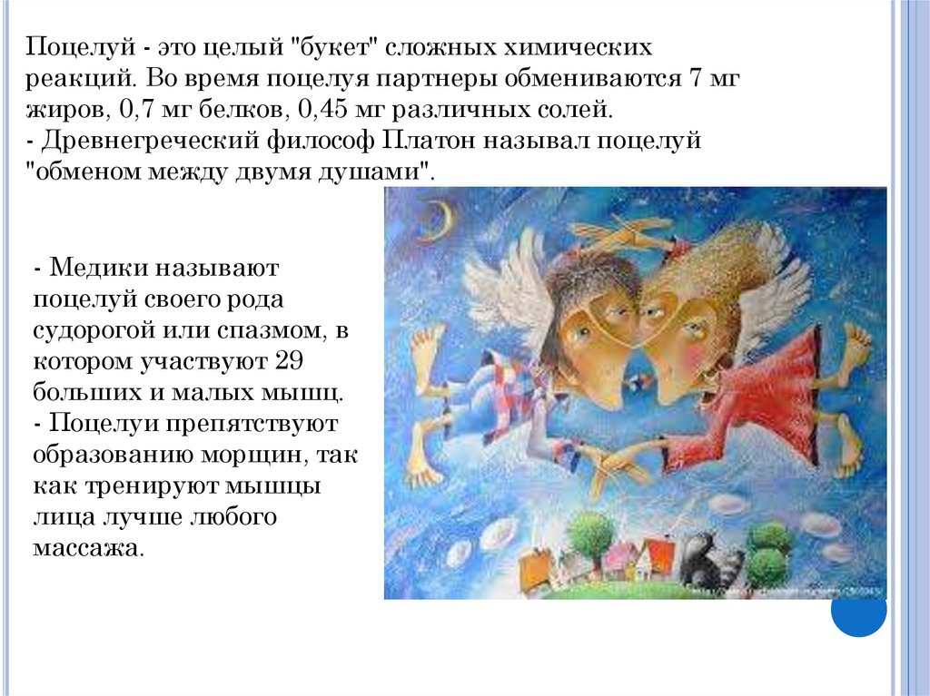 Поцелуй - это целый "букет" сложных химическихреакций. Во время поцелуя партнеры обмениваются 7 мг