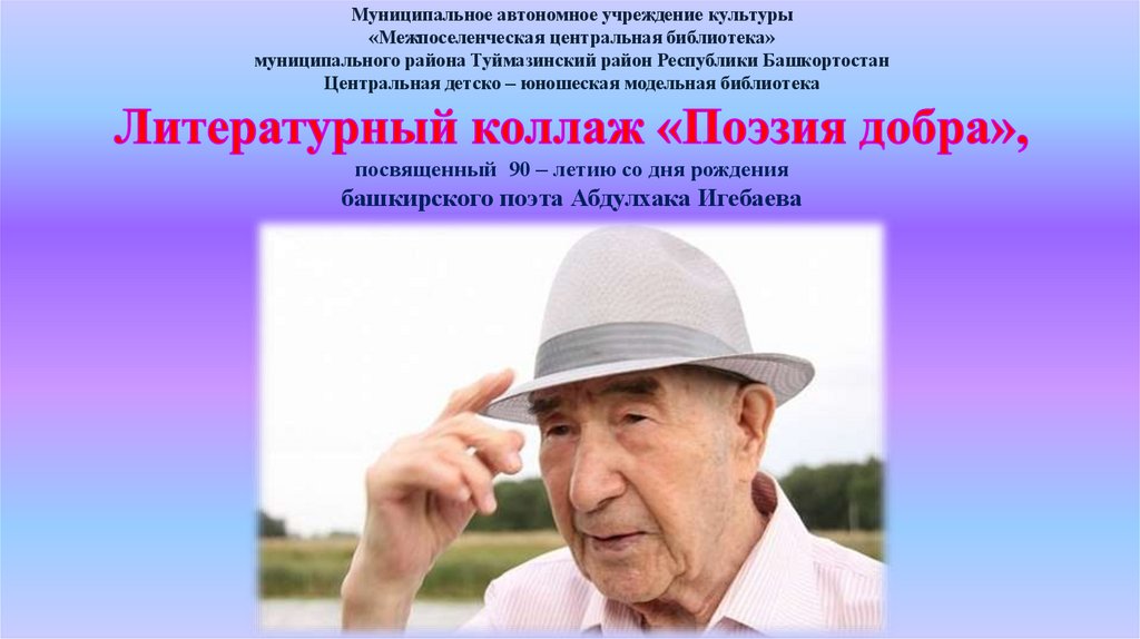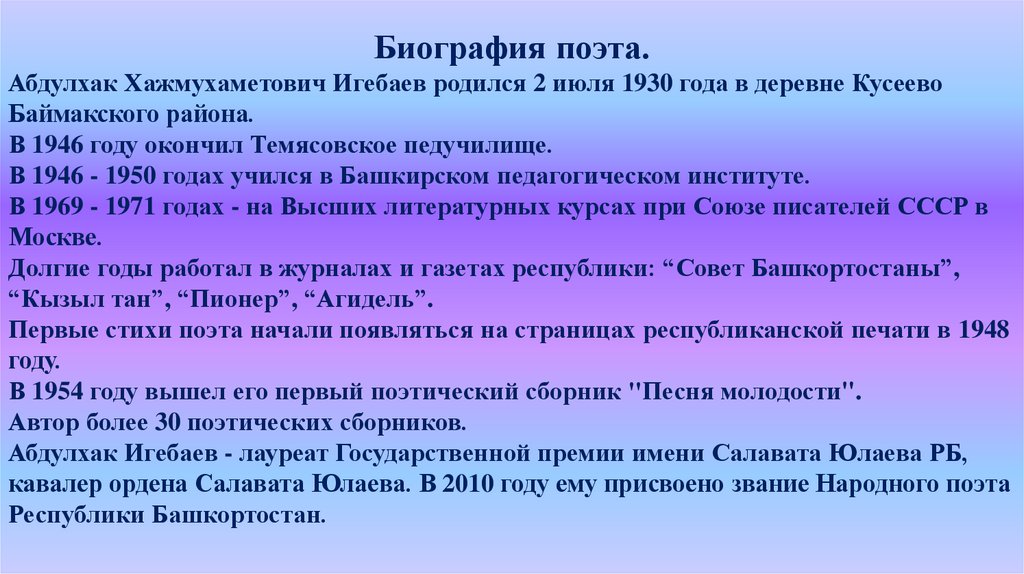 Биография поэта.Абдулхак Хажмухаметович Игебаев родился 2 июля 1930 года в деревне Кусеево