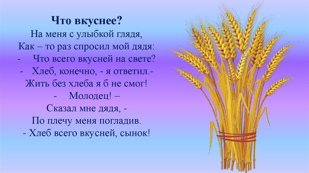 - Хлеб, конечно, - я ответил.Жить без хлеба я б не смог!