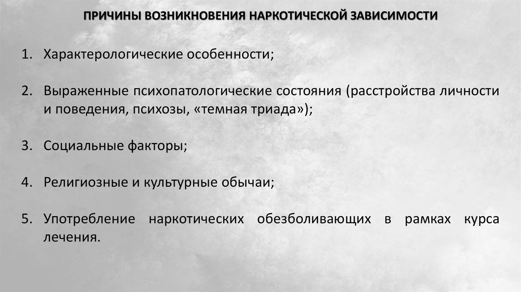 ПРИЧИНЫ ВОЗНИКНОВЕНИЯ НАРКОТИЧЕСКОЙ ЗАВИСИМОСТИ1. Характерологические особенности;