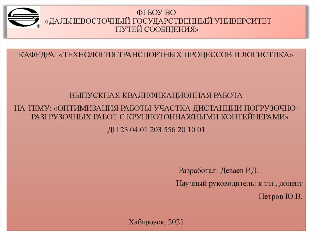 НА ТЕМУ: «ОПТИМИЗАЦИЯ РАБОТЫ УЧАСТКА ДИСТАНЦИИ ПОГРУЗОЧНОРАЗГРУЗОЧНЫХ РАБОТ С КРУПНОТОННАЖНЫМИ КОНТЕЙНЕРАМИ»