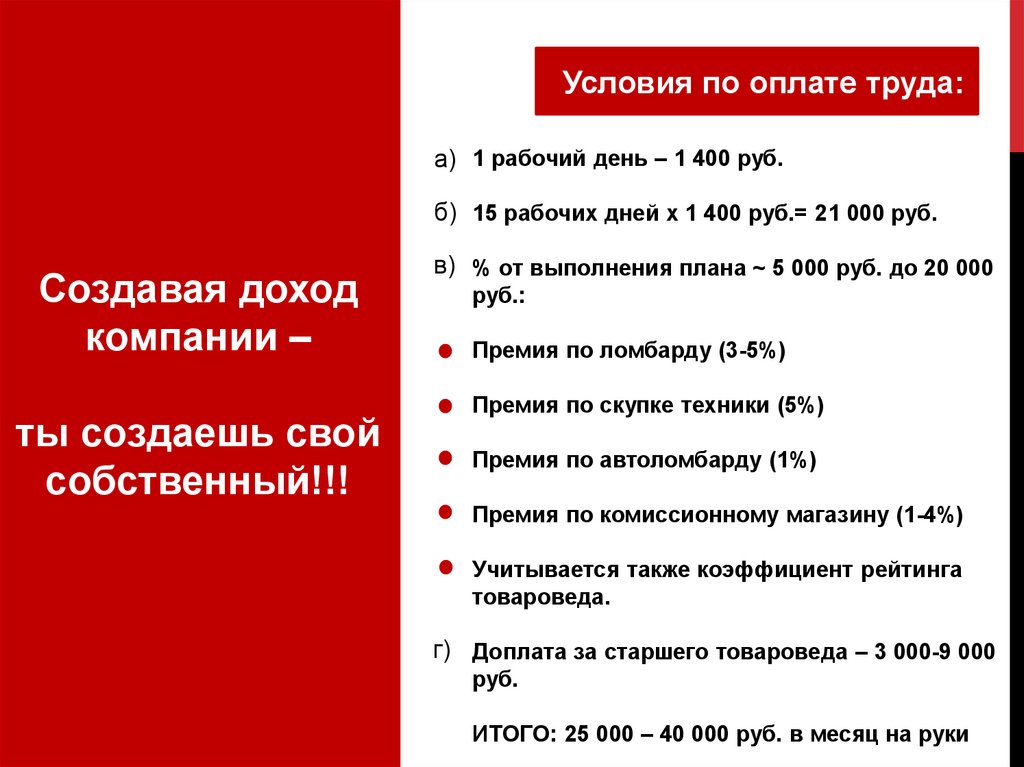 Условия по оплате труда:а) 1 рабочий день – 1 400 руб.