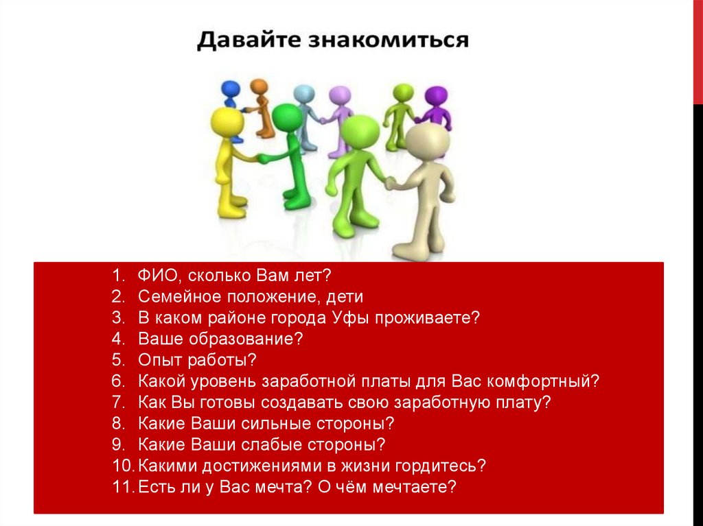 1. ФИО, сколько Вам лет?2. Семейное положение, дети