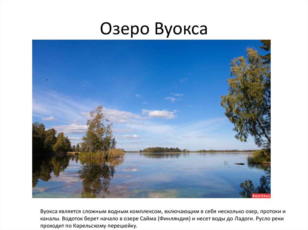 Озеро ВуоксаВуокса является сложным водным комплексом, включающим в себя несколько озер, протоки и