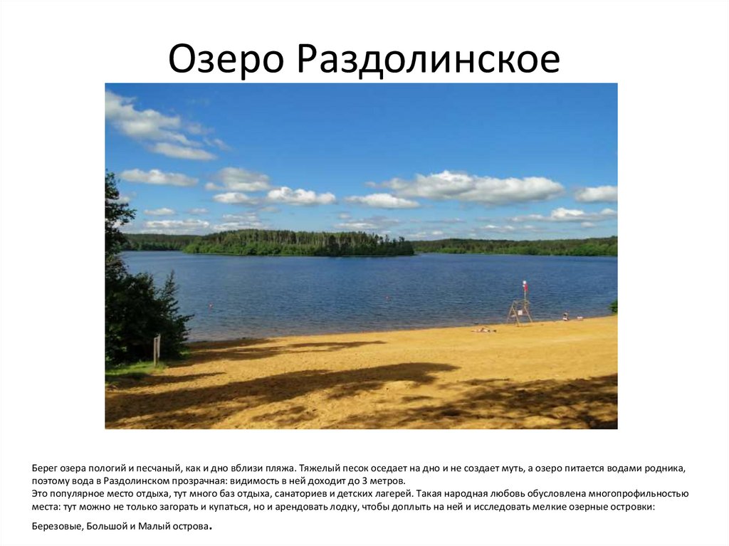 Озеро РаздолинскоеБерег озера пологий и песчаный, как и дно вблизи пляжа. Тяжелый песок оседает на дно и не создает муть, а озеро питается водами родника,