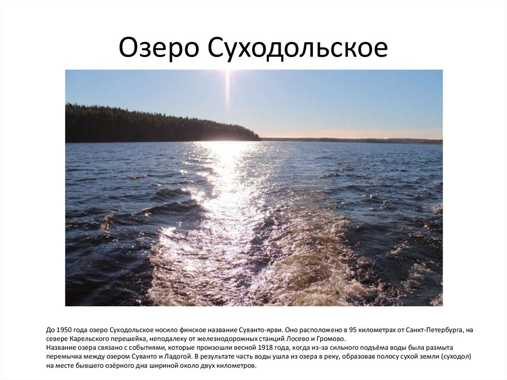 Озеро СуходольскоеДо 1950 года озеро Суходольское носило финское название Суванто-ярви. Оно расположено в 95 километрах от Санкт-Петербурга, на