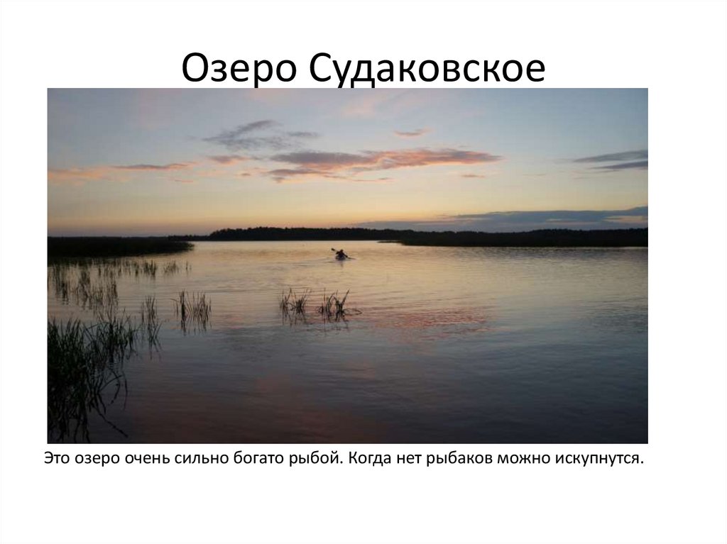 Озеро СудаковскоеЭто озеро очень сильно богато рыбой. Когда нет рыбаков можно искупнутся.
