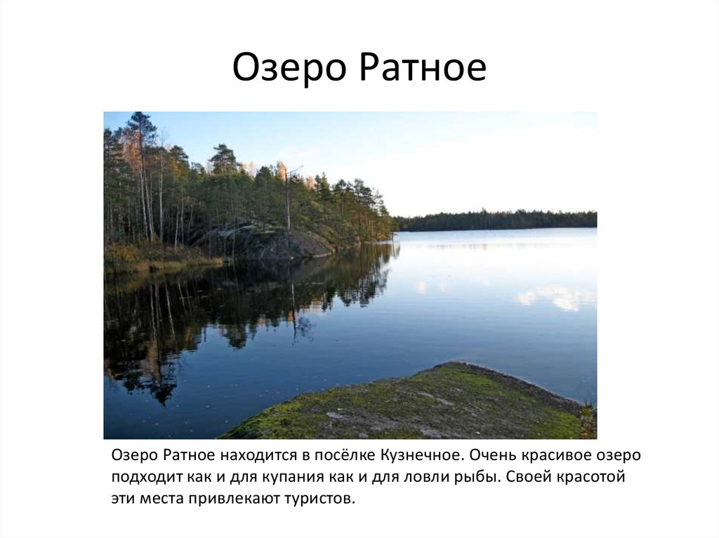 Озеро РатноеОзеро Ратное находится в посёлке Кузнечное. Очень красивое озеро