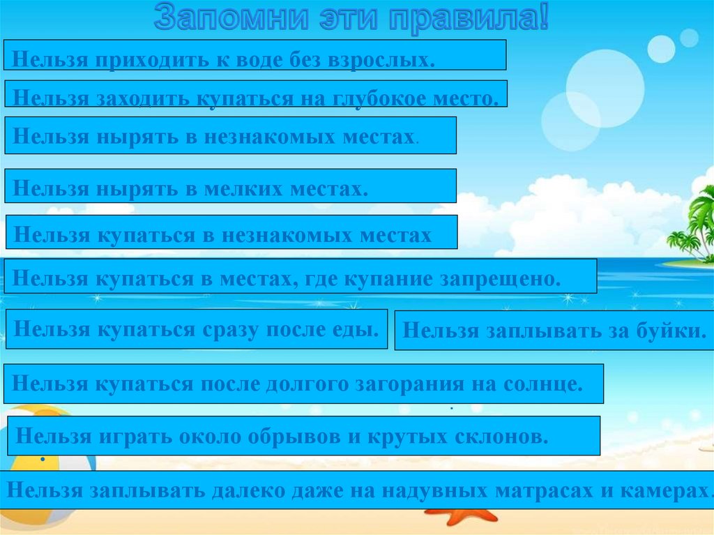 Нельзя купаться сразу после еды. Нельзя заплывать за буйки.