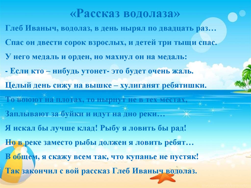 «Рассказ водолаза»Глеб Иваныч, водолаз, в день нырял по двадцать раз…