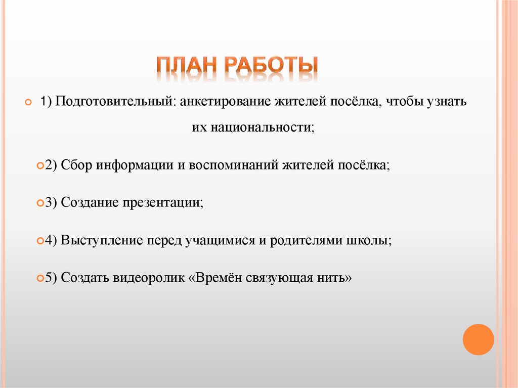 1) Подготовительный: анкетирование жителей посёлка, чтобы узнатьих национальности;