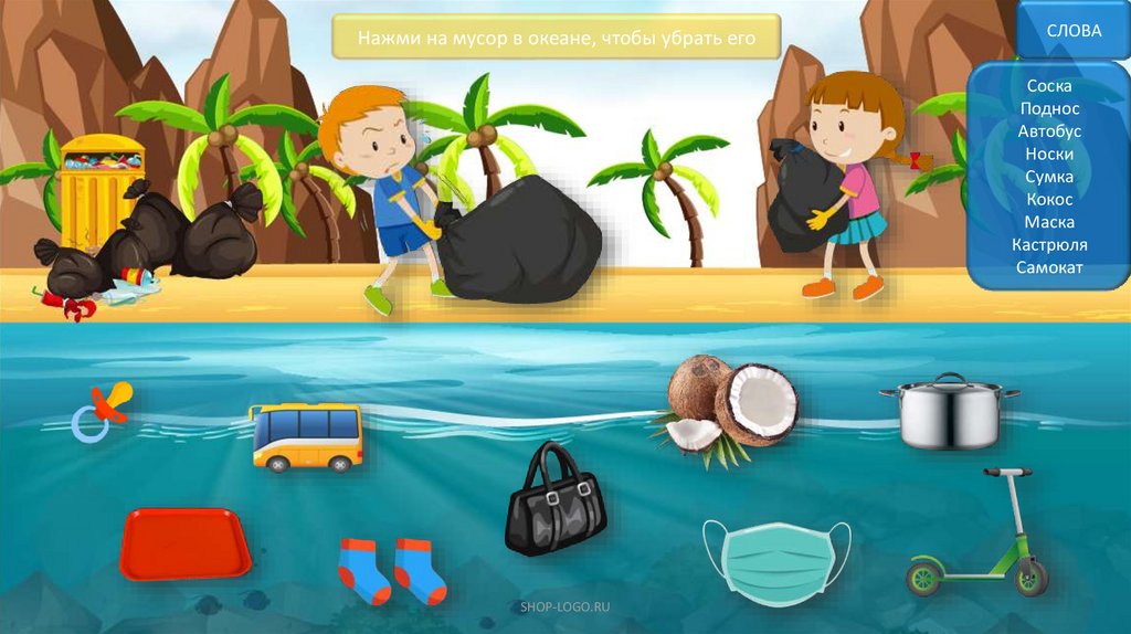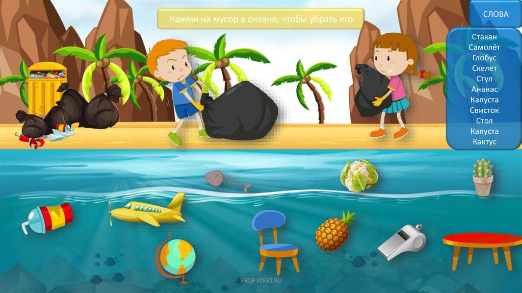 Нажми на мусор в океане, чтобы убрать егоСЛОВА