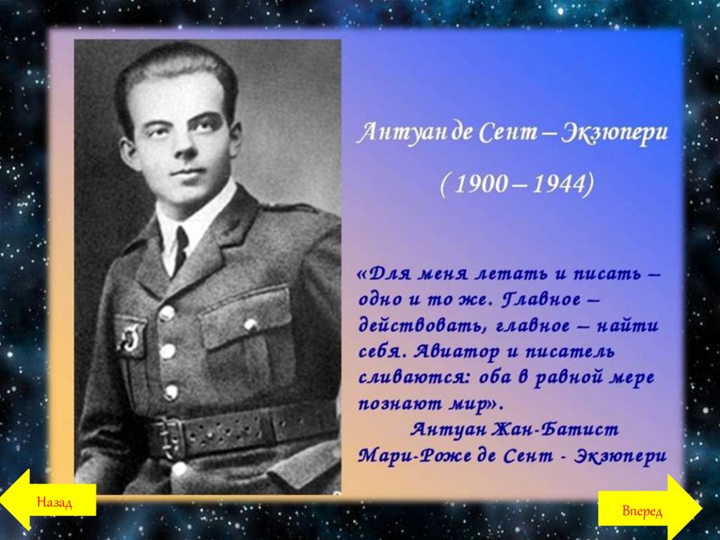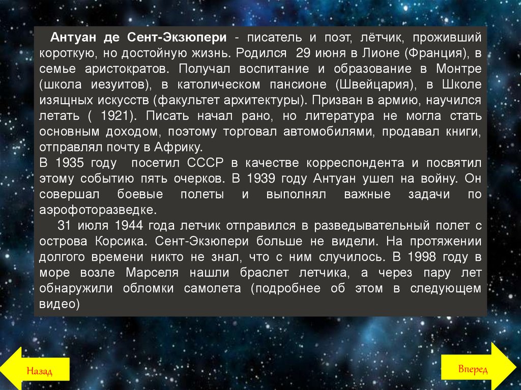 Антуан де Сент-Экзюпери - писатель и поэт, лётчик, прожившийкороткую, но достойную жизнь. Родился 29 июня в Лионе (Франция), в