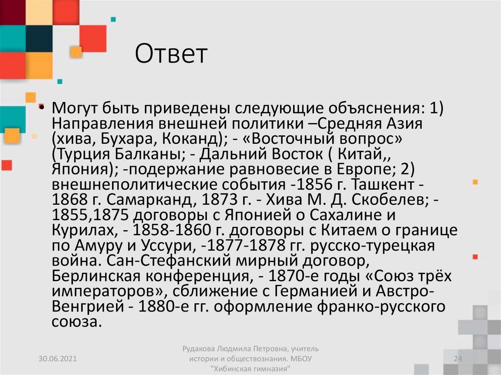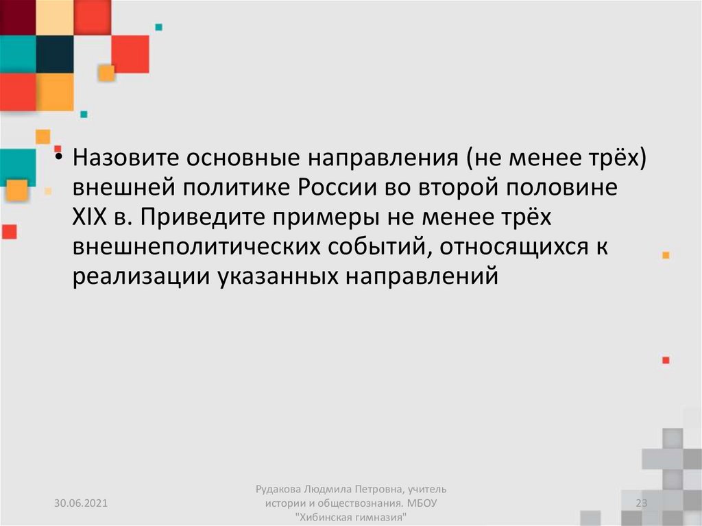 • Назовите основные направления (не менее трёх)внешней политике России во второй половине