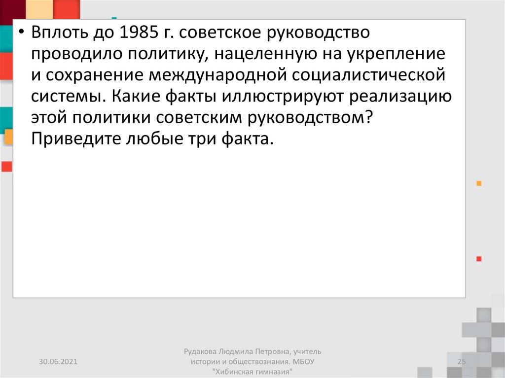 • Могут быть приведены следующие факты: 1) В1949 г. по инициативе СССР был создан СЭВ –