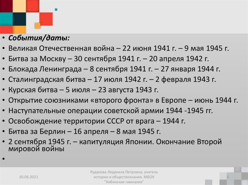 Великая Отечественная война – 22 июня 1941 г. – 9 мая 1945 г.