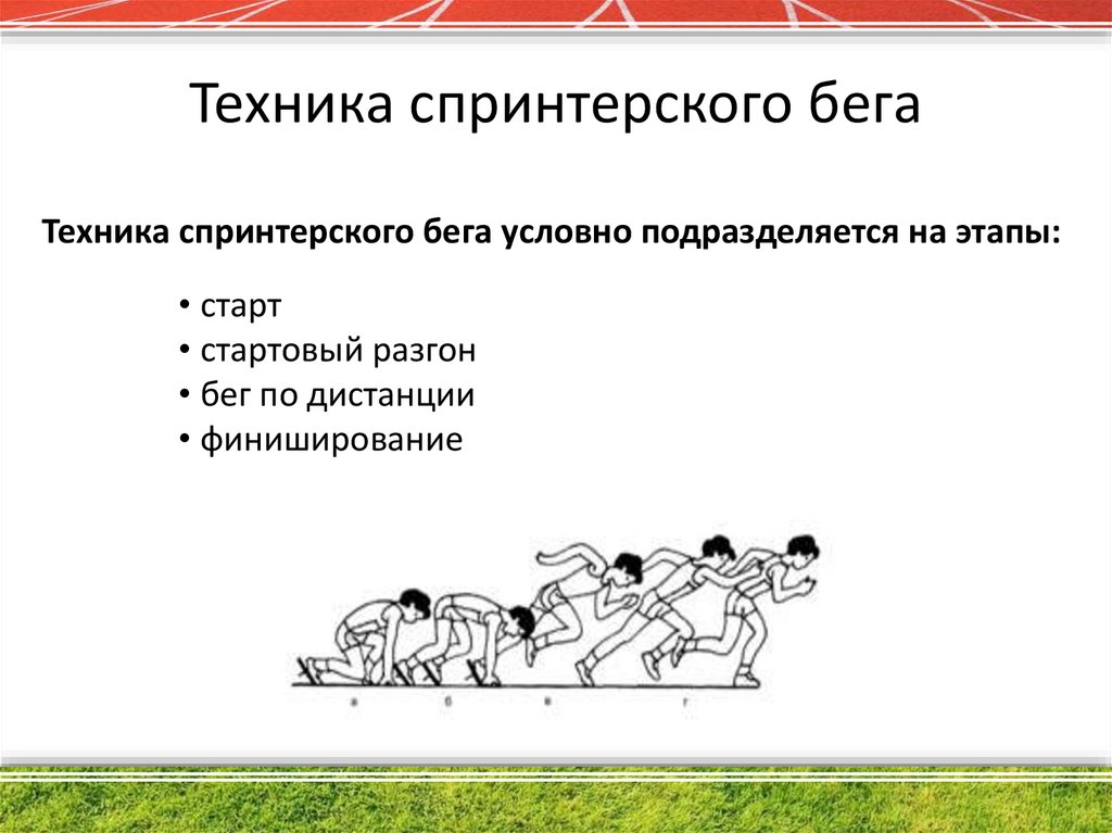 Техника спринтерского бегаТехника спринтерского бега условно подразделяется на этапы:
