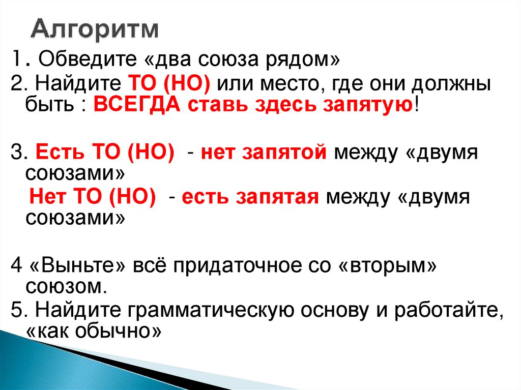 1. Обведите «два союза рядом»2. Найдите ТО (НО) или место, где они должны