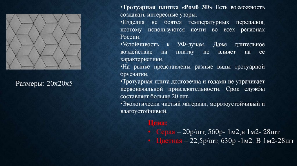 Размеры: 20х20х5•Тротуарная плитка «Ромб 3D» Есть возможность