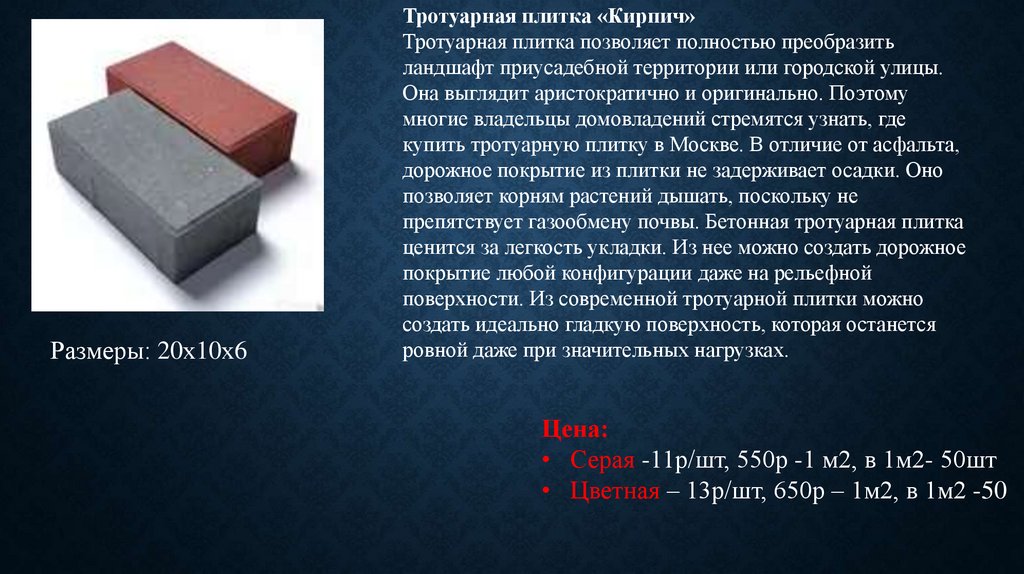 Размеры: 20х10х6Тротуарная плитка «Кирпич»